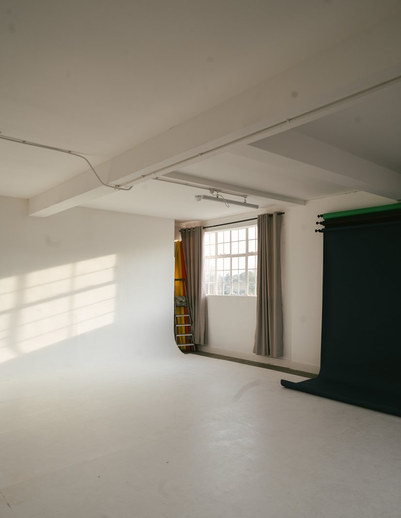 The studio features a white infinity cove along with various backdrops and polyboards, making it suitable for fashion shoots, product photography, and video production.